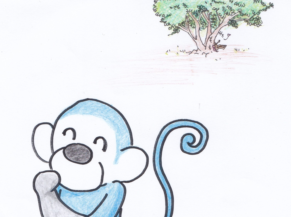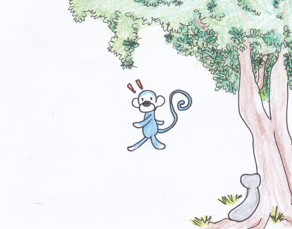 藍懶猴: 香蕉!這石頭跟香蕉好像阿,剛好可以拿來做門房造景,一定超級搭。 說完,就抱著像香蕉的石頭走了。 迷理貓與狼狼,完全沒發現石頭被藍懶猴帶走了。