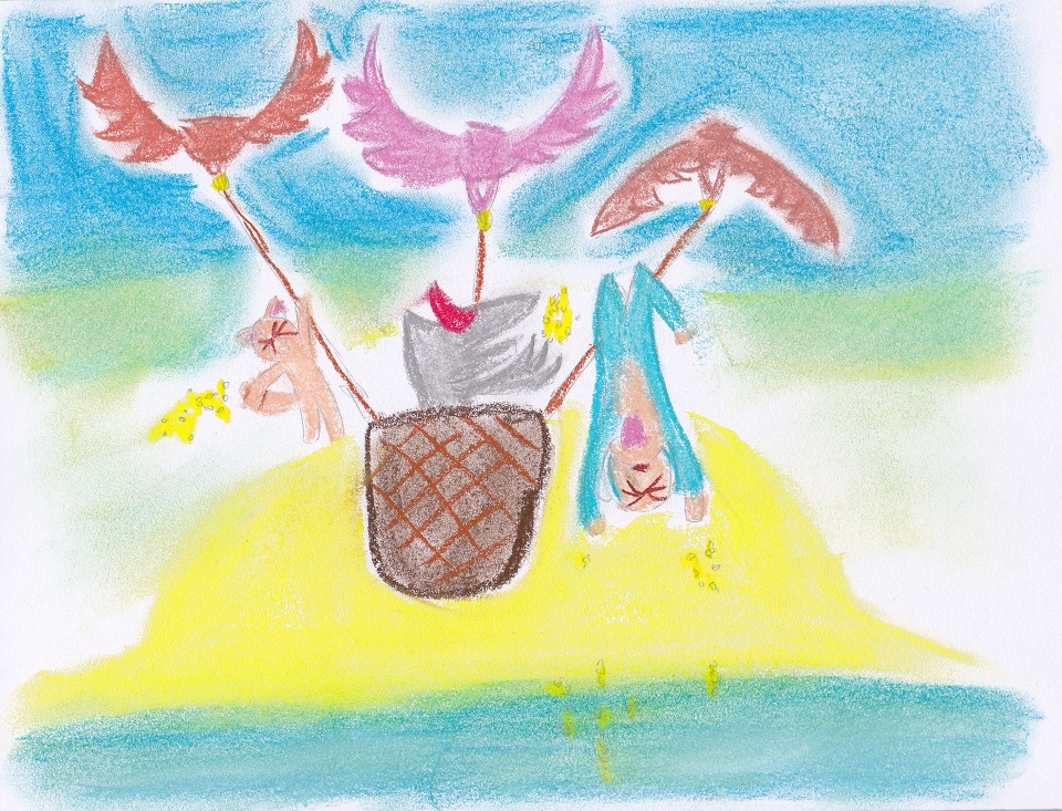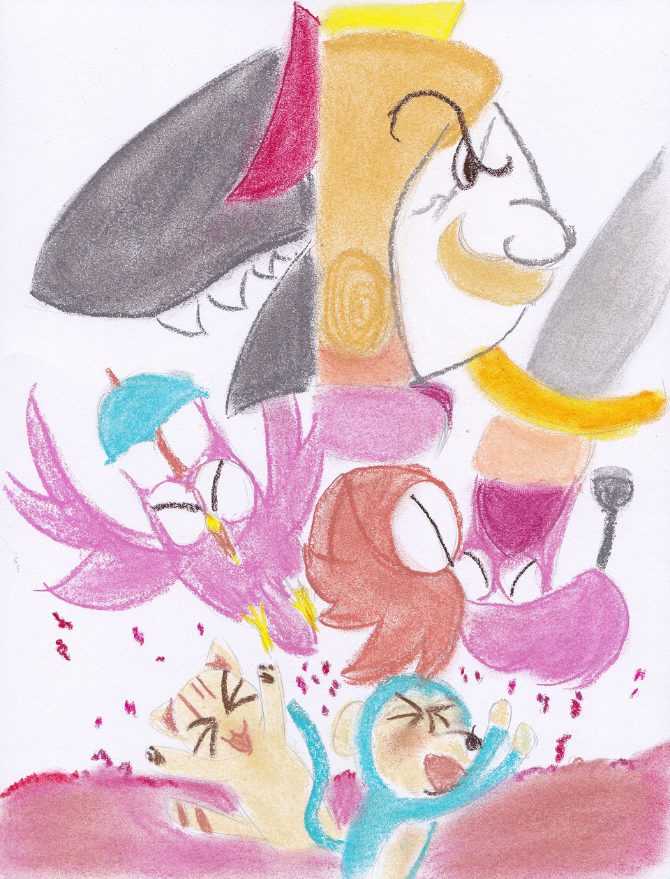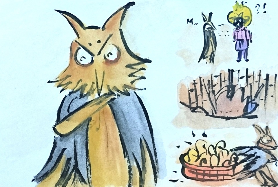 氣急敗壞的國王,從大洞探身出去,發現遠方有三隻貓頭鷹抓著三根繩子奮力飛翔, 繩子連接著一個大籃子,籃子裡面赫然是怪盜傑克、米米與吱吱, 傑克對著國王做了個鬼臉,比了個勝利的手勢, 國王這時才發現,原來他就是那位戴著斗蓬,貢獻計謀的人。
