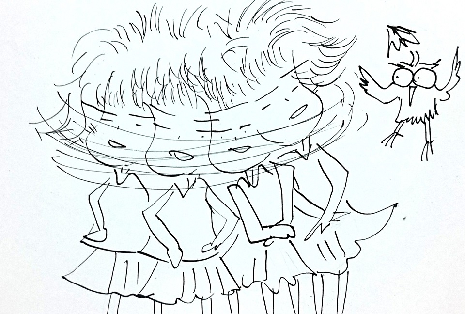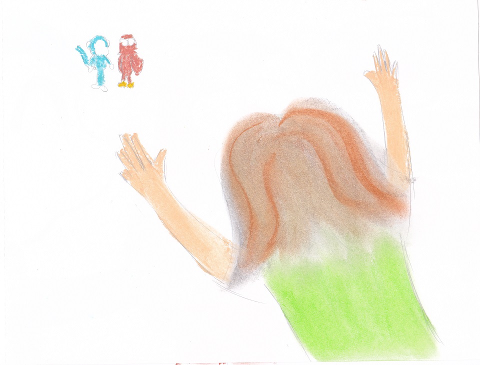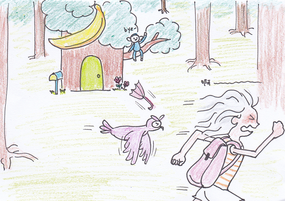 歐耶:「就知道歐爾會睡過頭!」(歐耶掀開窗簾看到歐爾小傘急急忙忙衝出門。)