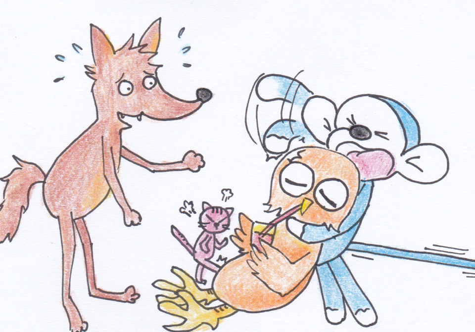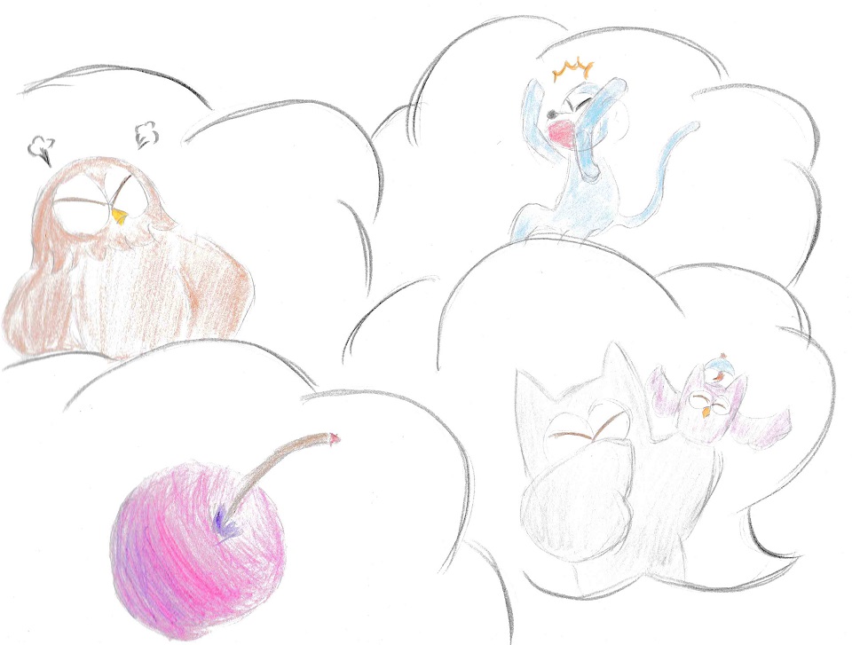 一大早狼狼把歐耶、藍懶猴、迷理貓找來家中,將昨天發生的事說出來。 歐耶:「一定是威爾森發揮魔力!」 狼狼:「威爾森?」 迷理貓:「就是小傘送歐耶的那一顆莓果啦。」 歐耶:「沒錯!絕對是威爾森搞的鬼!」 狼狼:「那顆莓果不是在你那裡,怎麼會跟歐爾有關?」 歐耶:「莓果被歐爾搶走了。」 「難道歐爾把它吃了...」 藍懶猴氣定神閒丶緩緩的說:「威爾森只是顆莓果,會不會太大驚小怪。更何況歐爾前幾天都很正常,搞不好是歐爾因為太想小傘才玩角色扮演遊戲?」 「不像啊,就算歐爾能模仿小傘的聲音,也不能同時發出兩種聲音。」 「難道布偶被邪靈附身了 」迷理貓睜大眼,「怎麼辦,怎麼辦。」 迷理貓仰頭跑來跑去。