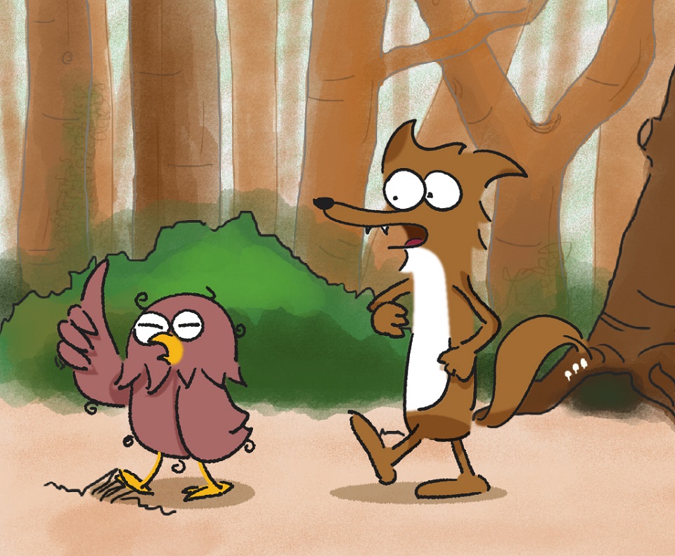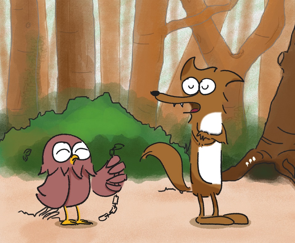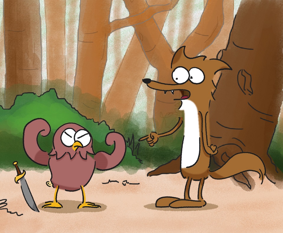 歐耶: 看看這個胸肌、腹肌、二頭肌、肌......(低頭玩自己的箭) 你看看,這把箭多漂亮阿,刀鋒銳利,刀形優雅,配上我這俊美無雙的長相,真是美到不行吶~ 話說完歐耶就把刀從前面甩到後面再甩到前面,不小心把自己的尾巴羽毛給切掉了,可是歐耶只覺得屁股怎麼涼涼的,狼狼假裝自己什麼都沒看到,但故意往後退了一步,深怕眼前這隻貓頭鷹一個不小心失手把刀砸了出來。 狼狼: 英俊帥美的鳥阿,為什麼你可以這麼英挺,保養的這麼好,有美食、美刀,還有澎澎呼呼有彈性的肉肉... 歐耶: 想要跟我一樣嗎 ? 離開這座森林吧,你瞧瞧,在這座森林裡的動物,那一個不是活得這麼辛苦,住的地方不安全,又常常找不到食物,多悲慘阿。學我吧,離開這裡,包你不愁吃穿,還可以有很多驚喜及樂趣。 狼狼: 那我要做些什麼阿? 歐耶: 什麼都不用做,只要動動嘴,偶爾跑跑腿,你就可以享受美味的食物,還可以拿到很多小玩意來調劑生活。 狼狼: 感覺好棒阿,我跟你走。 狼狼跟著歐耶,高興的上路了。